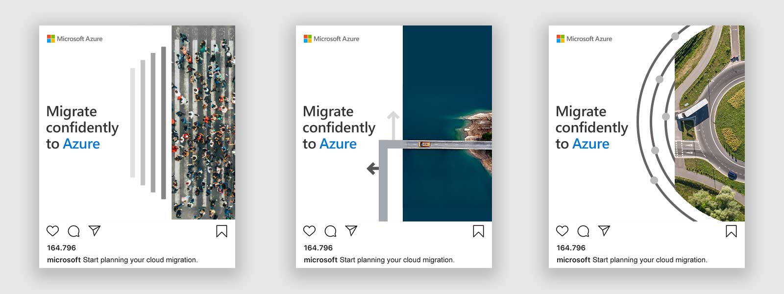 Based on the key insight that IT decision-makers prioritize trust and peace of mind during cloud migration, this campaign framed the process not as a complex, technical task but as a secure, well-planned journey, paired with aerial views of landscapes—highways, crosswalks, and intersections—that implied movement and a smooth transition.